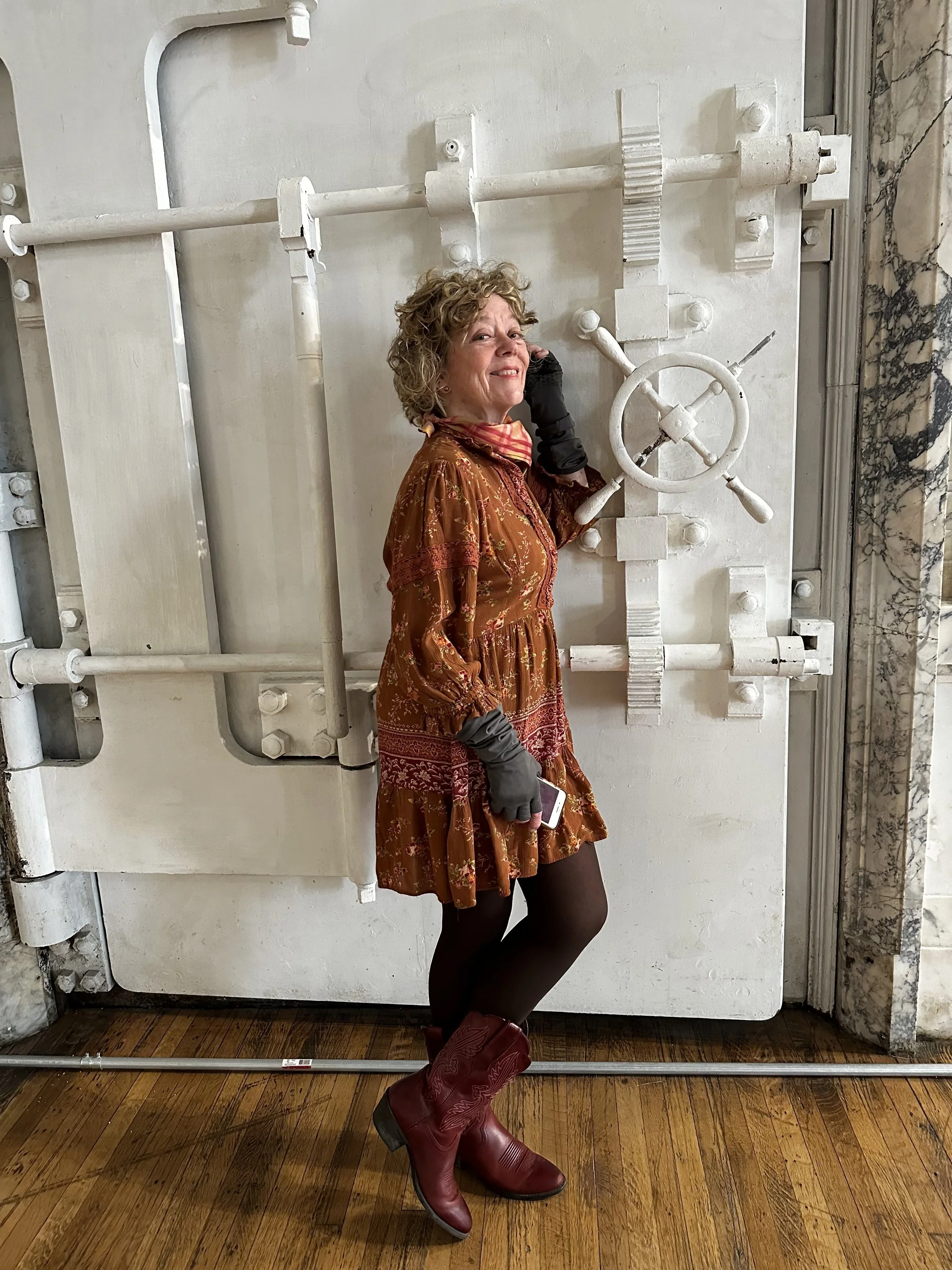 On a more day to day leve, L.L. confesses to adoring clothes and textiles in general, especially elegant vintage. One artist friend recently stayed at her home only to emerge saying “It was like being in a Villard painting”. Other friends who like her "never wear it twice" outfits suggest she post them daily. That is a little too much she demure. Instead, an more elevated inspiration struck her with the thwarting of a crazy mad impulse. While living in Manhattan ,one day riding the M4 down Fifth Avenue heading to a mindless, underpaid temp. job, she passed Fifth Avenues Bergdorf Goodman. “I loved every dress in the window.. I felt like smashing the bus window and the store window and running off with all the dresses, blood stains or no.”